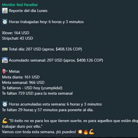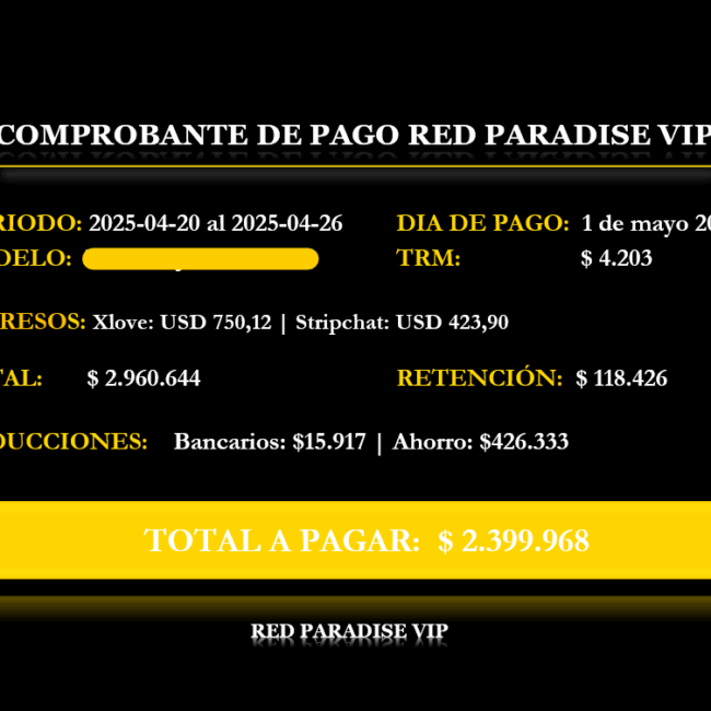Red Paradise VIP es un estudio de modelaje webcam ubicado en Bogotá, Colombia, que nació con el propósito de brindar un espacio seguro, profesional y exclusivo para mujeres que desean crecer en esta industria. Nuestro enfoque es humano y personalizado: tratamos a cada modelo como una cliente VIP. Contamos con entrenamientos individuales, clases de expresión corporal, asesoría psicológica, acompañamiento administrativo y un equipo que te apoya 24/7 para que logres tus metas.